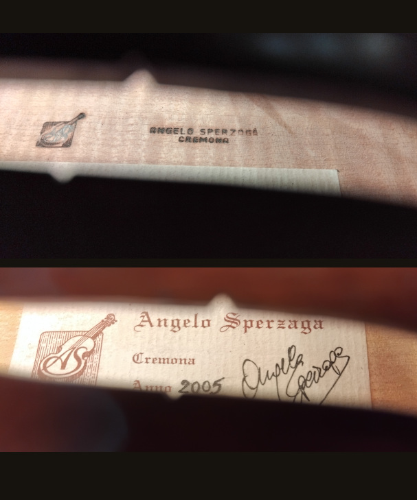 Tillverkad 2005 i Cremona. Angelo Sperzaga föddes 1968 i Cremona. Han öpnnade eget 1990 efter att ha arbetat i Scolaris verkstad i tre år. Sedan 1998 arbetar han som lärare på The International School of Violinmaking i Cremona.