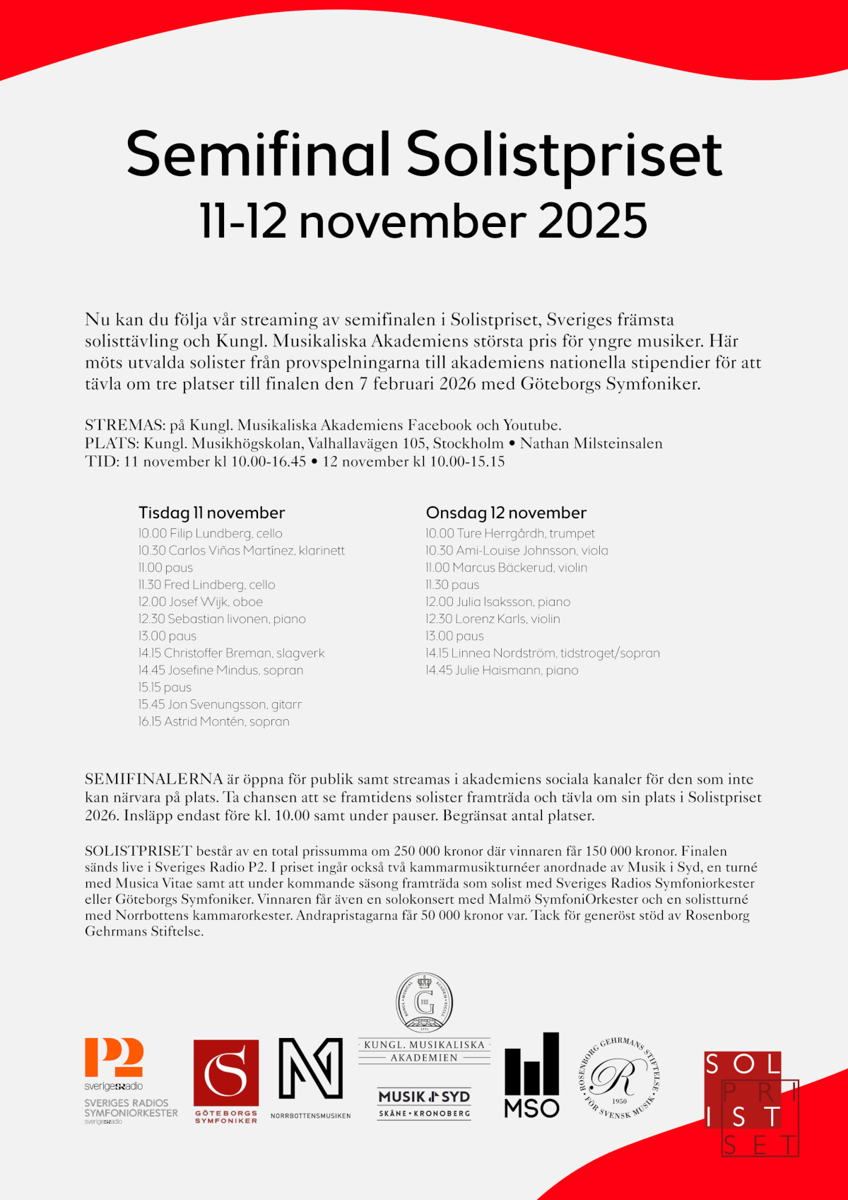 Nu kan du följa semifinalen och finalen av Kungl. Musikaliska Akademiens solistpris på Youtube och Facebook. Du hittar streaminglänkarna här.